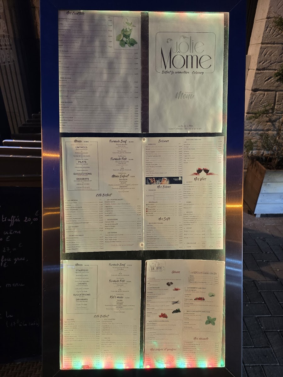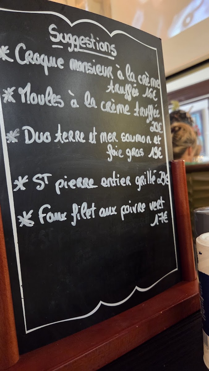 The menu is structured to accommodate casual dining and quick orders throughout the day, making it suitable for light meals, lunch, or dinner. The variety of dishes and drinks caters to those interested in seafood as well as classic French cuisine.